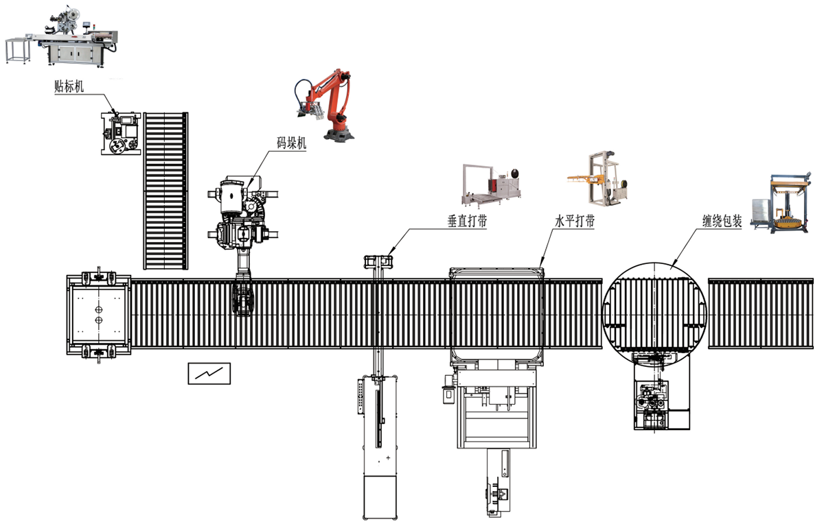 工藝流程為: 全自動灌裝包裝系統-定量包裝稱-自動縫包機-倒袋整平機-爬坡輸送機-金屬檢測儀-重量檢測儀-剔除機托盤庫-碼垛機器人-搖臂纏繞機-出貨