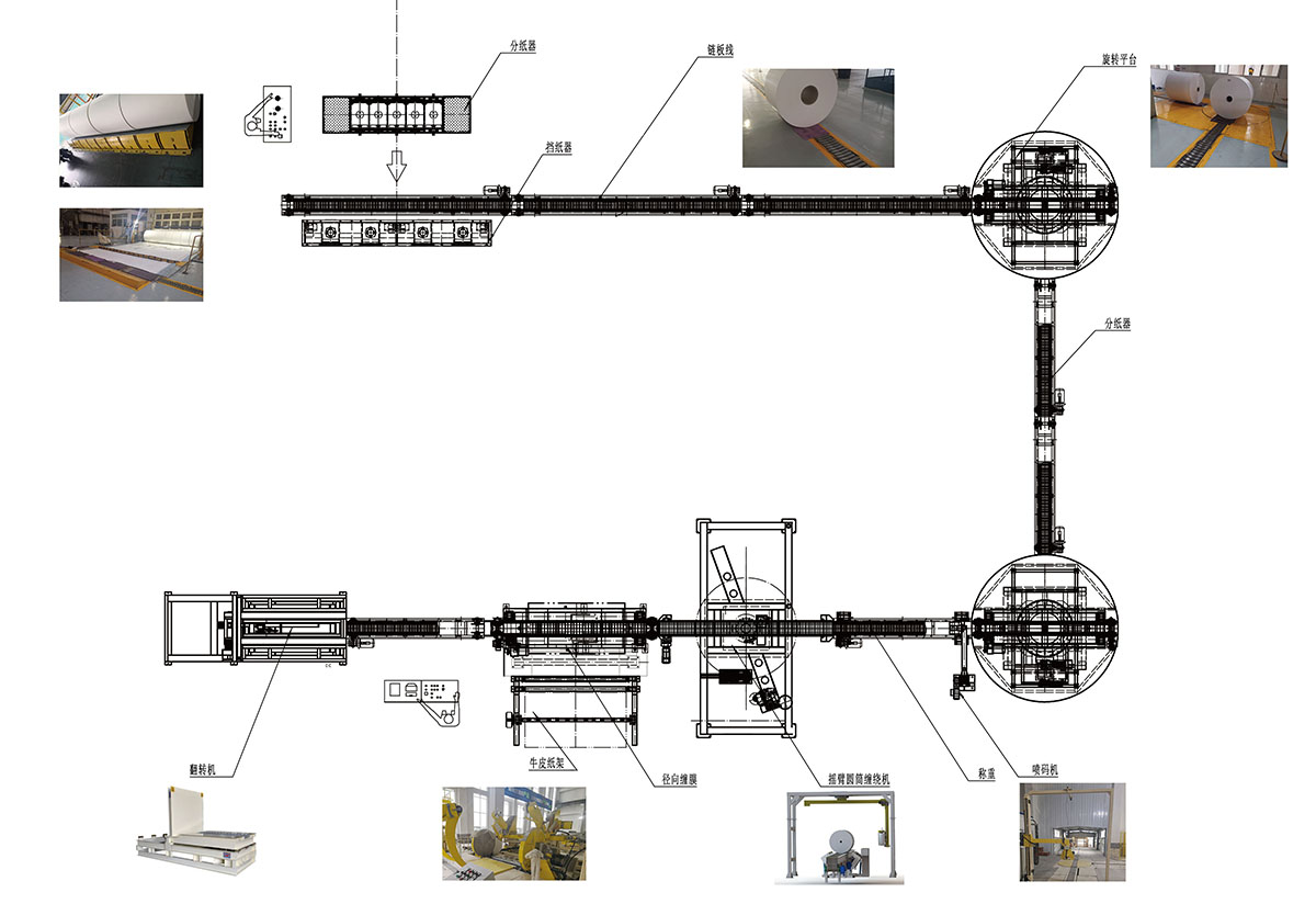 工藝流程:復卷機臺下來的紙卷-止動分配器-氣動擋紙器-鏈板輸送機-電動轉盤-稱重裝置-自動噴碼機-自動貼標機-自動捆扎機(纏膜)-豎身升降機